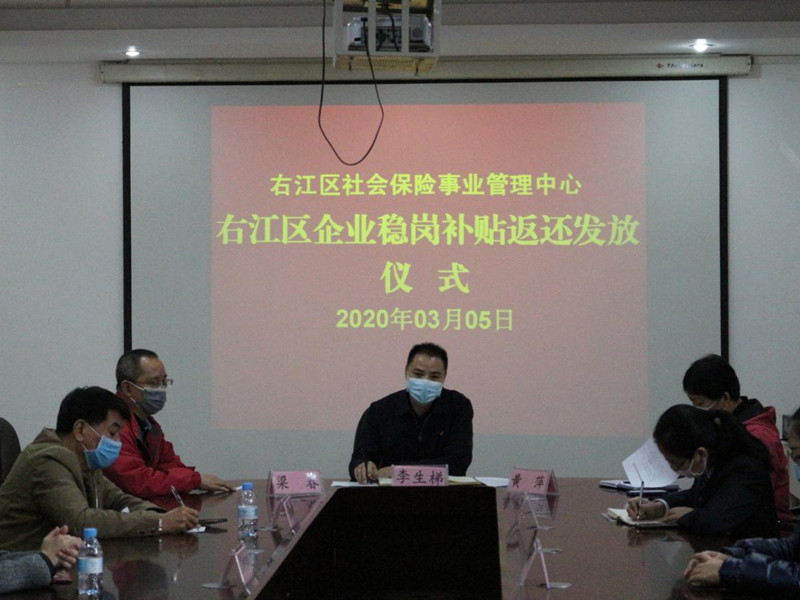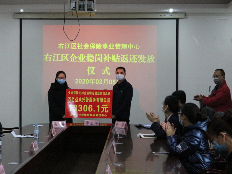 ??? 3月5日,在右江區(qū)社會保險事業(yè)管理中心召開穩(wěn)崗補貼返還工作會議暨企業(yè)穩(wěn)崗補貼返還發(fā)放儀式,我公司作為首批返還企業(yè)代表之一應(yīng)邀參加,會上社保中心主任李生梯對我公司響應(yīng)穩(wěn)崗補貼政策給予高度肯定,期望通過穩(wěn)崗補貼返還為公司的穩(wěn)定復產(chǎn)助力。截止目前,我公司有8家子公司符合享受失業(yè)保險穩(wěn)崗返還補貼條件,獲得穩(wěn)崗返還補貼3.6萬元,惠及企業(yè)員工約150人。(通訊員:黃 芬)