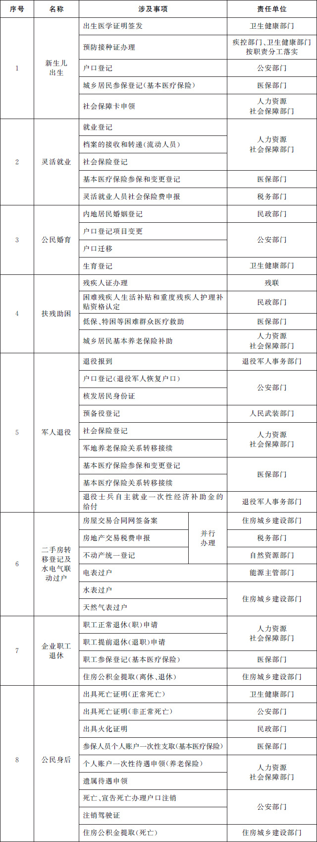 (二)推進(jìn)個人全生命周期相關(guān)政務(wù)服務(wù)事項“一件事一次辦”。圍繞個人從出生到身后全生命周期的重要階段,梳理集成同一階段內(nèi)需要辦理的多個單一政務(wù)服務(wù)事項,為群眾提供新生兒出生、入園入學(xué)、大中專學(xué)生畢業(yè)、就業(yè)、就醫(yī)、婚育、扶殘助困、軍人退役、二手房交易及水電氣聯(lián)動過戶、退休、身后等集成化辦理服務(wù),切實提升群眾辦事便捷度,減少跑動次數(shù)。