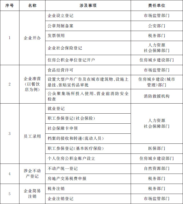 (一)推進(jìn)企業(yè)全生命周期相關(guān)政務(wù)服務(wù)事項“一件事一次辦”。圍繞企業(yè)從開辦到注銷全生命周期的重要階段,梳理集成同一階段內(nèi)需要到政府部門、公用企事業(yè)單位和服務(wù)機(jī)構(gòu)辦理的多個單一政務(wù)服務(wù)事項,為企業(yè)提供開辦、工程建設(shè)、生產(chǎn)經(jīng)營、惠企政策兌現(xiàn)、員工錄用、不動產(chǎn)登記、注銷等集成化辦理服務(wù),提高辦事效率,降低辦事成本。