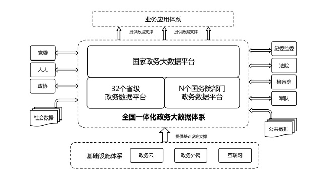 全國(guó)一體化政務(wù)大數(shù)據(jù)體系包括三類平臺(tái)和三大支撐。三類平臺(tái)為“1+32+N”框架結(jié)構(gòu)?!?”是指國(guó)家政務(wù)大數(shù)據(jù)平臺(tái),是我國(guó)政務(wù)數(shù)據(jù)管理的總樞紐、政務(wù)數(shù)據(jù)流轉(zhuǎn)的總通道、政務(wù)數(shù)據(jù)服務(wù)的總門戶;“32”是指31個(gè)?。ㄗ灾螀^(qū)、直轄市)和新疆生產(chǎn)建設(shè)兵團(tuán)統(tǒng)籌建設(shè)的省級(jí)政務(wù)數(shù)據(jù)平臺(tái),負(fù)責(zé)本地區(qū)政務(wù)數(shù)據(jù)的目錄編制、供需對(duì)接、匯聚整合、共享開放,與國(guó)家平臺(tái)實(shí)現(xiàn)級(jí)聯(lián)對(duì)接;“N”是指國(guó)務(wù)院有關(guān)部門的政務(wù)數(shù)據(jù)平臺(tái),負(fù)責(zé)本部門本行業(yè)數(shù)據(jù)匯聚整合與供需對(duì)接,與國(guó)家平臺(tái)實(shí)現(xiàn)互聯(lián)互通,尚未建設(shè)政務(wù)數(shù)據(jù)平臺(tái)的部門,可由國(guó)家平臺(tái)提供服務(wù)支撐。三大支撐包括管理機(jī)制、標(biāo)準(zhǔn)規(guī)范、安全保障三個(gè)方面。