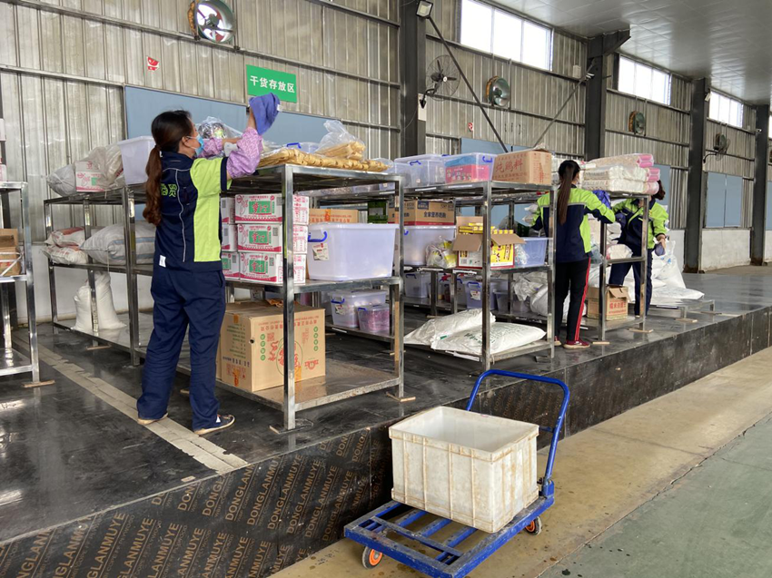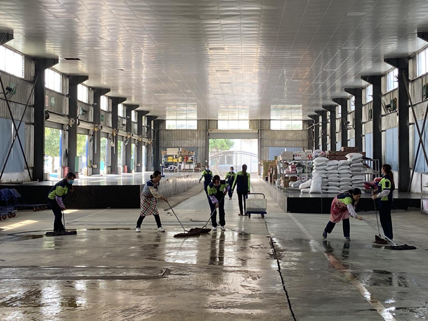 在倉庫,員工們對貨物架、倉庫地板進(jìn)行清潔、擦拭,保證貨物在合適的環(huán)境下儲存。