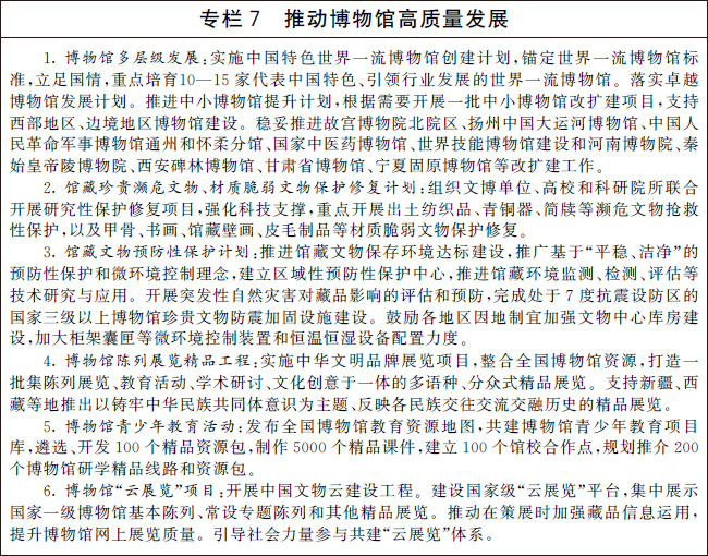 實施中國特色世界一流博物館創(chuàng)建計劃。支持省級、重要地市級博物館特色化發(fā)展。盤活基層博物館資源。探索建立行業(yè)博物館聯(lián)合認(rèn)證、共建共管機(jī)制。規(guī)范和扶持非國有博物館發(fā)展,落實支持政策,依法依規(guī)推進(jìn)非國有博物館法人財產(chǎn)權(quán)確權(quán)。認(rèn)真履行相關(guān)審批程序,有序推動建設(shè)一批反映黨和國家建設(shè)成就的當(dāng)代主題博物館和行業(yè)博物館,重點支持建設(shè)反映中華文明發(fā)展歷程的國家級重點專題博物館,倡導(dǎo)建設(shè)特色專題博物館。探索在文化資源豐厚地區(qū)建設(shè)“博物館之城”。