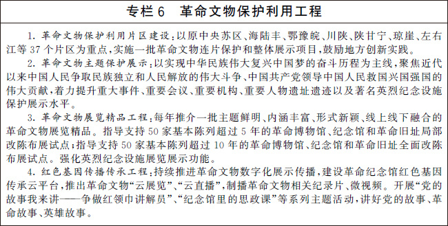 整合文物、黨史、軍史、檔案、地方志等方面研究力量,加強(qiáng)革命文物保護(hù)利用研究,開展實物、文獻(xiàn)、檔案、史料和口述史征集,挖掘革命文物深刻內(nèi)涵,推出重要研究成果,旗幟鮮明反對和抵制歷史虛無主義,繼續(xù)發(fā)揚偉大建黨精神,傳承弘揚井岡山精神、長征精神、遵義會議精神、延安精神、西柏坡精神、紅巖精神、抗美援朝精神、“兩彈一星”精神、特區(qū)精神、抗洪精神、抗震救災(zāi)精神、抗疫精神、脫貧攻堅精神等偉大精神。