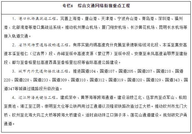 加快解決制約人民美好出行、貨物高效流通的瓶頸,強(qiáng)化綜合交通網(wǎng)絡(luò)有機(jī)銜接。打通公路省際待貫通路段,加強(qiáng)干線公路與城市道路有效銜接,推進(jìn)城鎮(zhèn)密集地區(qū)干線公路過境段、進(jìn)出城瓶頸路段升級(jí)改造。加強(qiáng)樞紐機(jī)場(chǎng)與軌道交通高效銜接,使換乘更加便捷。強(qiáng)化進(jìn)港區(qū)、進(jìn)園區(qū)、進(jìn)廠區(qū)、進(jìn)規(guī)?;r(nóng)產(chǎn)品基地等集疏運(yùn)設(shè)施建設(shè),加快推動(dòng)鐵路進(jìn)港口重點(diǎn)港區(qū)和大型工礦企業(yè)、物流園區(qū)、重點(diǎn)物資儲(chǔ)備庫(kù)。統(tǒng)籌考慮資源高效利用、生態(tài)環(huán)境保護(hù)和防洪航運(yùn)安全,有序建設(shè)各種運(yùn)輸方式共享通道資源的過江跨海通道。推動(dòng)超大特大城市的大型綜合客運(yùn)樞紐間通過軌道交通互連。加快實(shí)現(xiàn)聯(lián)系緊密的綜合貨運(yùn)樞紐間通過聯(lián)絡(luò)線或?qū)S猛ǖ阑ミB。