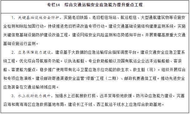 健全綜合交通運(yùn)輸應(yīng)急管理體制機(jī)制,完善應(yīng)急協(xié)調(diào)機(jī)制和應(yīng)急預(yù)案體系,加強(qiáng)交通運(yùn)輸調(diào)度與應(yīng)急指揮平臺(tái)建設(shè)。推進(jìn)區(qū)域性公路應(yīng)急裝備物資儲(chǔ)備中心建設(shè)。加強(qiáng)水上交通安全監(jiān)管、航海保障和救助打撈能力建設(shè),完善沿海和內(nèi)河溢油應(yīng)急設(shè)備庫(kù),構(gòu)建陸??仗煲惑w化水上交通運(yùn)輸安全保障體系。建設(shè)城市軌道交通應(yīng)急演練中心。以骨干航空物流企業(yè)為主體構(gòu)建航空應(yīng)急服務(wù)網(wǎng)絡(luò)。建設(shè)海事監(jiān)管指揮系統(tǒng)。在開展城市交通基礎(chǔ)設(shè)施地下空間、低洼區(qū)域、重點(diǎn)區(qū)段、重要點(diǎn)位、關(guān)鍵設(shè)施等隱患排查基礎(chǔ)上,建立健全風(fēng)險(xiǎn)臺(tái)賬和災(zāi)害隱患清單,補(bǔ)齊設(shè)施設(shè)備、應(yīng)急搶險(xiǎn)物資等短板,持續(xù)完善應(yīng)急處置預(yù)案,健全應(yīng)急響應(yīng)機(jī)制,提升應(yīng)對(duì)極端天氣能力。加強(qiáng)應(yīng)急專業(yè)隊(duì)伍和志愿者隊(duì)伍建設(shè),充實(shí)國(guó)家應(yīng)急運(yùn)輸儲(chǔ)備力量。健全應(yīng)對(duì)重大疫情、防范應(yīng)對(duì)恐怖襲擊、保障信息安全等非傳統(tǒng)安全應(yīng)急指揮體系和應(yīng)急交通組織。