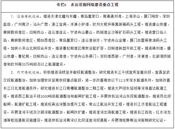 優(yōu)化暢通水運(yùn)設(shè)施網(wǎng)絡(luò)。建設(shè)京津冀、長(zhǎng)三角、粵港澳大灣區(qū)世界級(jí)港口群,支持山東打造世界一流的海洋港口,推進(jìn)東北地區(qū)沿海港口一體化發(fā)展,優(yōu)化港口功能布局,推動(dòng)資源整合和共享共用。有序推進(jìn)沿海港口專業(yè)化碼頭及進(jìn)出港航道等公共設(shè)施建設(shè)。適度超前建設(shè)糧食、能源、礦產(chǎn)資源的接卸、儲(chǔ)存、中轉(zhuǎn)設(shè)施,推進(jìn)沿海沿江液化天然氣碼頭規(guī)劃建設(shè)。提升內(nèi)河港口專業(yè)化、規(guī)模化水平,合理集中布局集裝箱、煤炭、鐵礦石、商品汽車等專業(yè)化碼頭。加強(qiáng)內(nèi)河高等級(jí)航道擴(kuò)能升級(jí)與暢通攻堅(jiān)建設(shè),完善長(zhǎng)江、珠江、京杭運(yùn)河和淮河等水系內(nèi)河高等級(jí)航道網(wǎng)絡(luò),進(jìn)一步提升珠三角高等級(jí)航道網(wǎng)出海能力,全面加強(qiáng)長(zhǎng)三角、珠江—西江高等級(jí)航道網(wǎng)未達(dá)標(biāo)段建設(shè)。推動(dòng)重要支流航道和庫(kù)湖區(qū)航道、內(nèi)河旅游航道、便民碼頭建設(shè)。